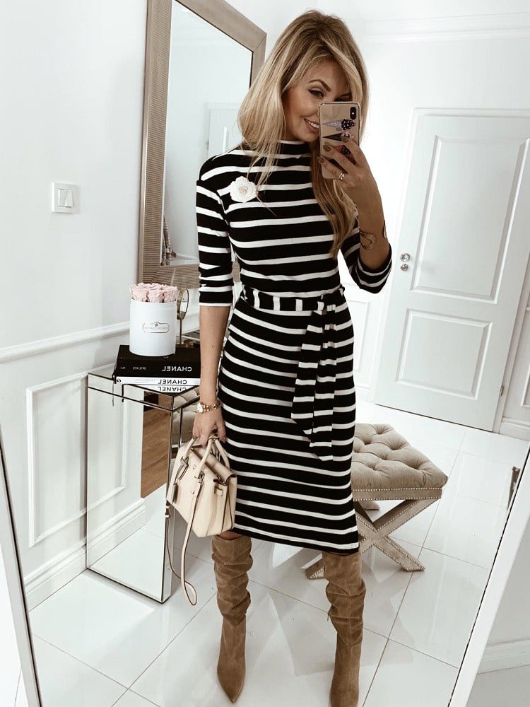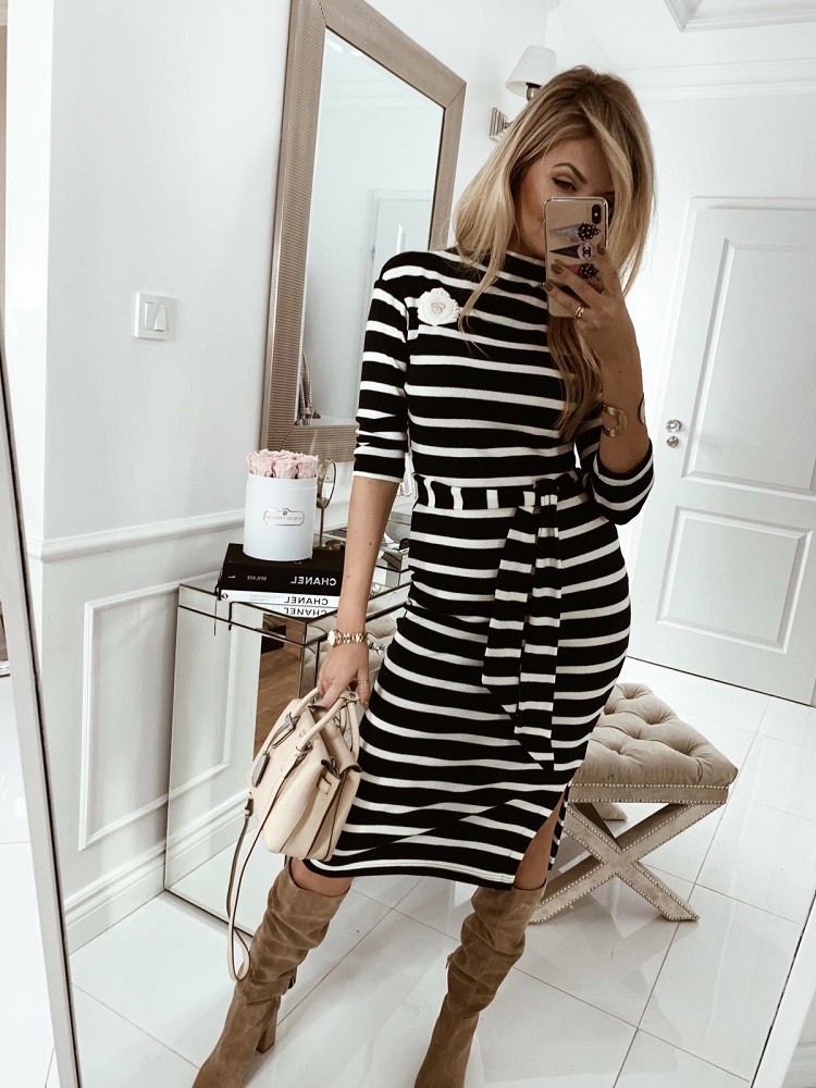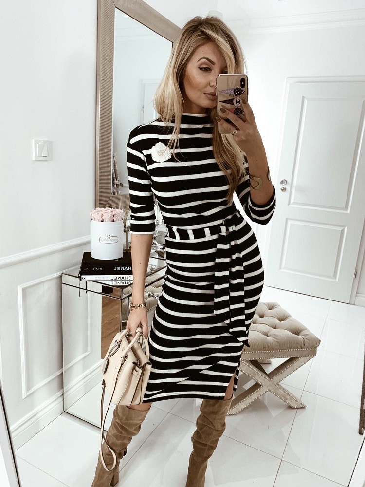 Nietuzinkowa, granatowa sukienka MAMAJ ozdobiona białymi paskami. Dzianinowy materiał zapewnia komfort i wygodę, taliowany krój świetnie podkreśla sylwetkę. Charakteru dodaje delikatny półgolf i tarcza z logo na przodzie oraz materiałowy pasek. Made in Poland .