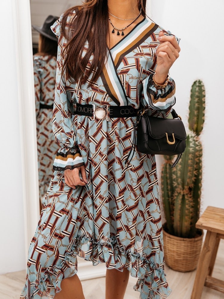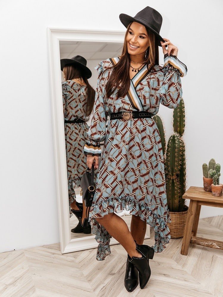 Piękna ,kobieca sukienka Matilla wykonana jest z lekkiego materiału. Wyjątkowym atutem jest asymetryczne wykończenie. Ściągacz w talii i głęboki V-dekolt dodają kobiecości i podkreślają atuty sylwetki. W zestawie pasek zapinany na klamrę. Pod spodem znajduje się podszewka. Made in Poland .