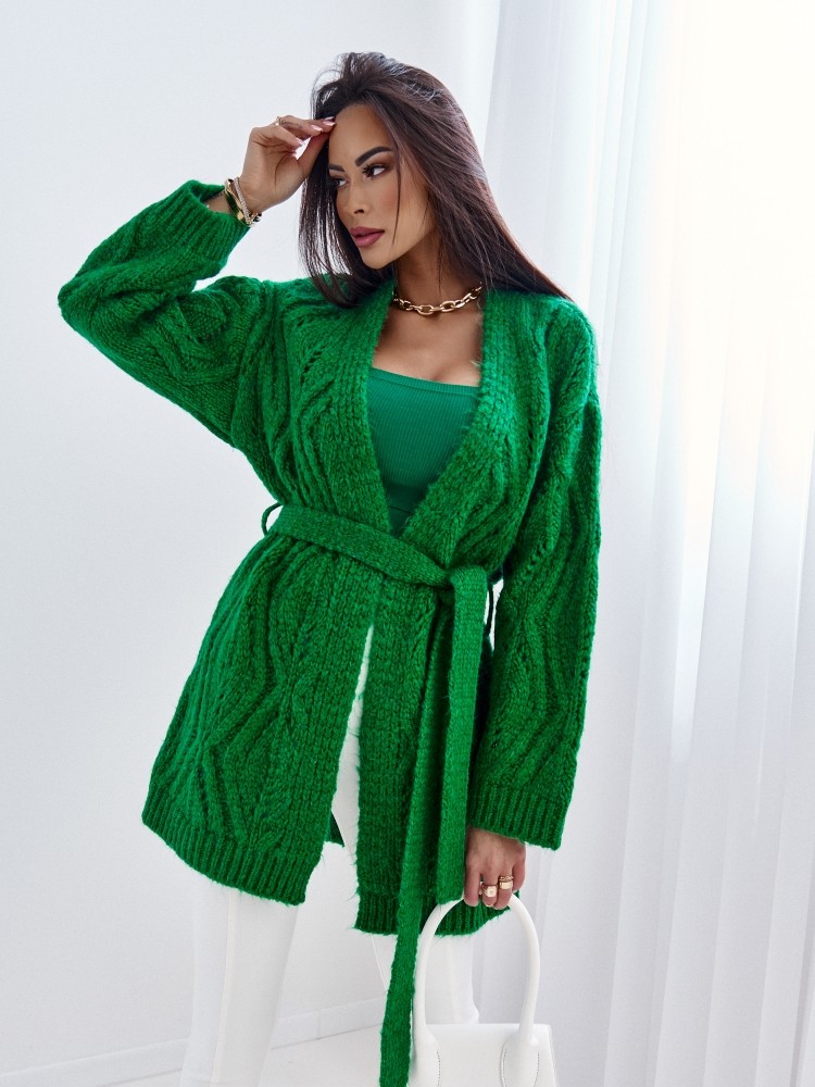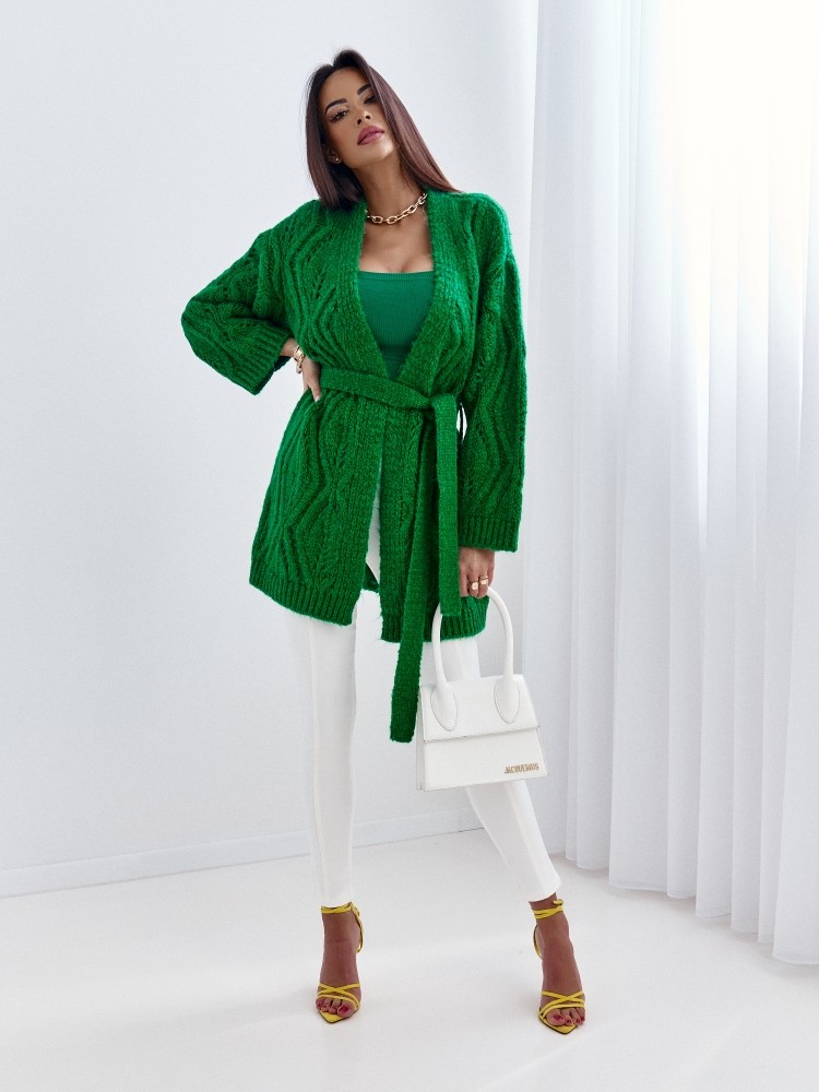 Wyjątkowy, mięsisty kardigan Livia, wykonany na polskiej dziewiarni z wysokiej jakości przędzy. Ażurowy splot dodaje uroku i oryginalności. Dodatkowym atutem jest pasek do przewiązania w talii.