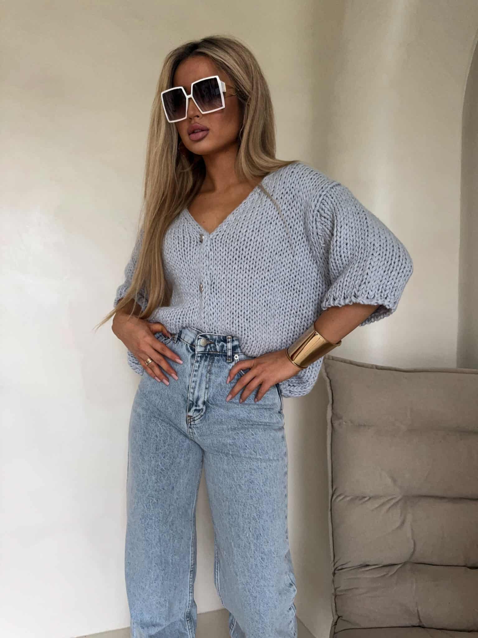 Luźny kardigan o oversizowym kroju, wykonany z miękkiej, przyjemnej w dotyku dzianiny. Model z krótkim rękawem oraz dekoltem w kształcie litery V, który subtelnie podkreśla sylwetkę. Zapinany na ozdobne guziki, stanowiące stylowy akcent całości.
