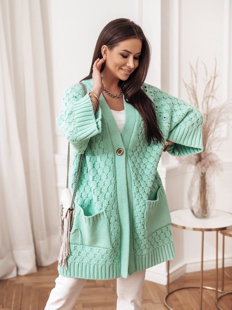 Piękny, kardigan Seli, wykonany z mięsistej, miękkiej w dotyku przędzy. Z powodzeniem zastąpi klasyczny płaszcz. Zapinany na drewniane guziki. Dodatkowym atutem są szerokie kieszenie. Made in Poland.