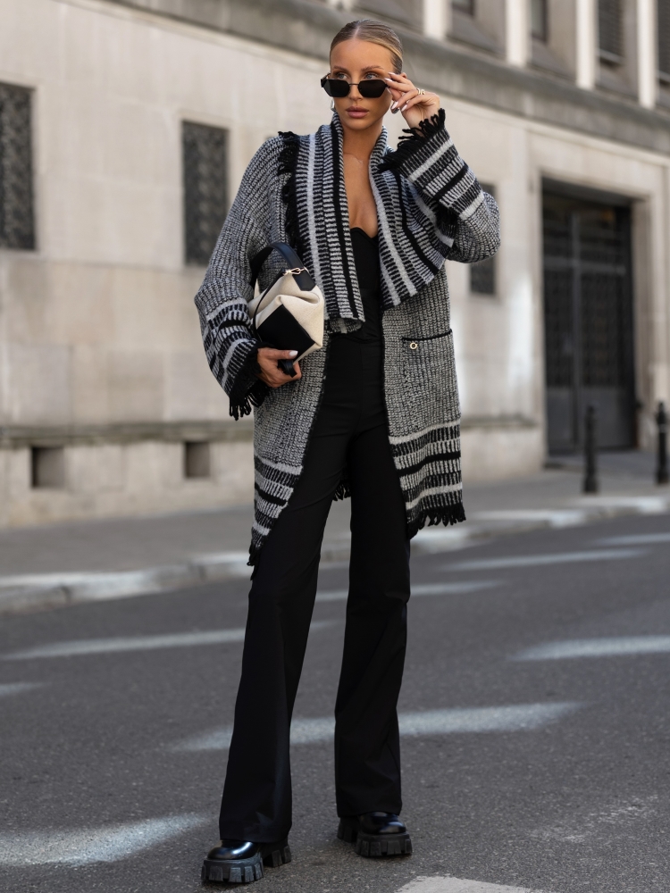 Sweter Severus to kardigan, wykonany z wysokiej jakości mięsistej i miłej w dotyku przędzy. Z przodu posiada praktyczne kieszenie. Opadający kołnierz podkreśli atuty sylwetki. Całość wieńczą ponadczasowe frędzle na wykończeniach. Polski producent
