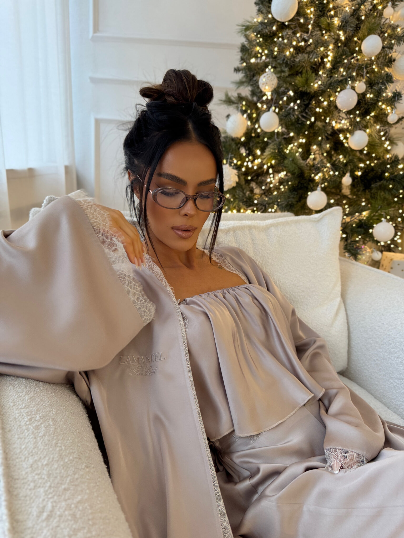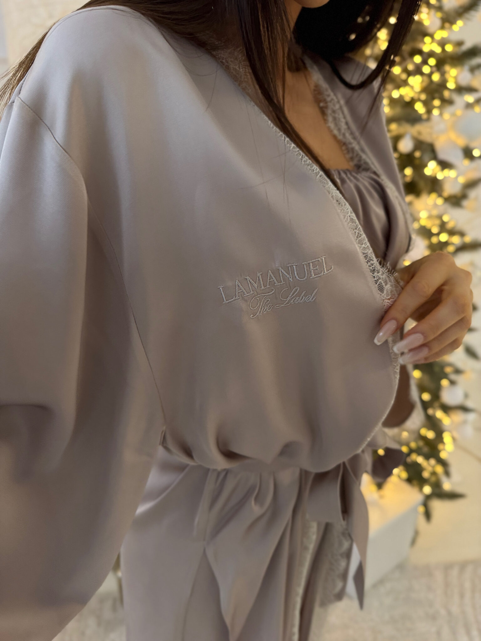 Szlafrok, który wygląda jak luksus – i dokładnie taki jest. Wykonany z wysokogatunkowej, naturalnej wiskozy o satynowym wykończeniu, gwarantuje nie tylko wyjątkową miękkość, ale też przewiewność i komfort noszenia. Tkanina pięknie się układa, subtelnie błyszczy i jest przyjemna dla skóry – nawet tej najbardziej wymagającej. Delikatna koronka i haftowane logo LAMANUEL podkreślają jego wyrafinowany charakter. To produkt klasy premium, który robi wrażenie – od materiału po każdy detal. Idealny dla kobiety, która wybiera jakość i chce czuć się wyjątkowo – codziennie.