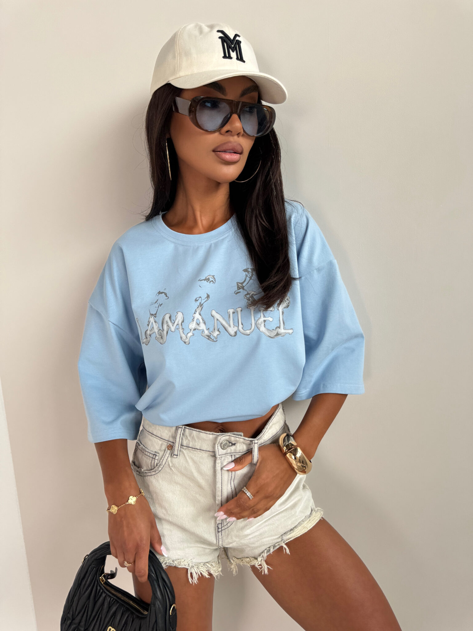T-shirt o luźnym, oversize’owym kroju z obniżoną linią ramion i szerokimi rękawami. Wykonany z miękkiej, przewiewnej dzianiny, która zapewnia komfort noszenia. Na przodzie znajduje się wyrazisty nadruk z nazwą marki w artystycznym stylu przypominającym efekt dymu. Idealny do codziennych, swobodnych stylizacji, zarówno do jeansów, jak i szortów.