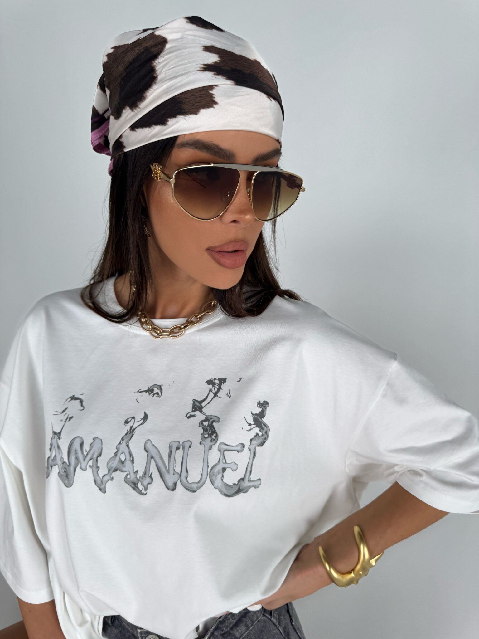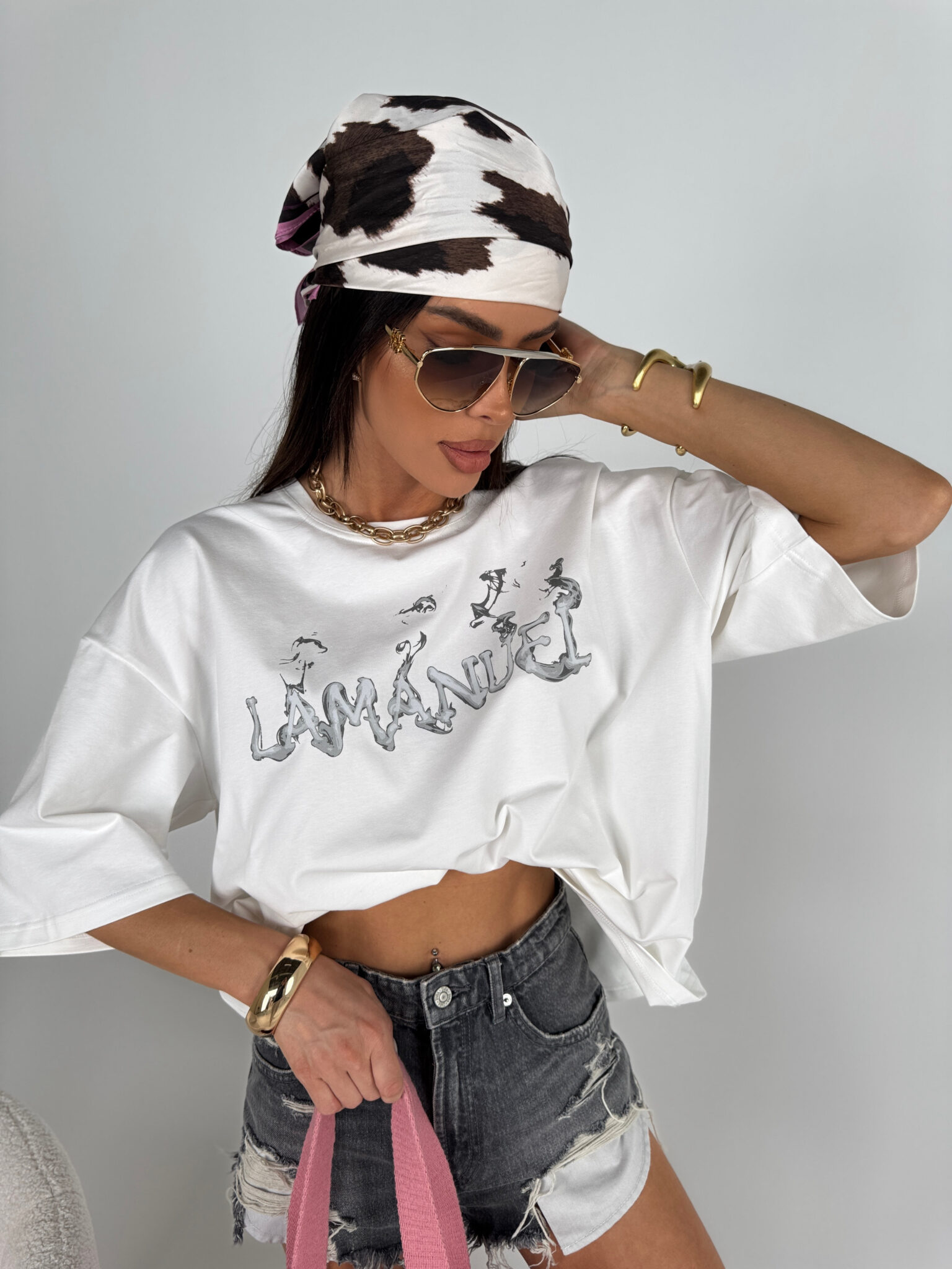 T-shirt o luźnym, oversize’owym kroju z obniżoną linią ramion i szerokimi rękawami. Wykonany z miękkiej, przewiewnej dzianiny, która zapewnia komfort noszenia. Na przodzie znajduje się wyrazisty nadruk z nazwą marki w artystycznym stylu przypominającym efekt dymu. Idealny do codziennych, swobodnych stylizacji, zarówno do jeansów, jak i szortów.