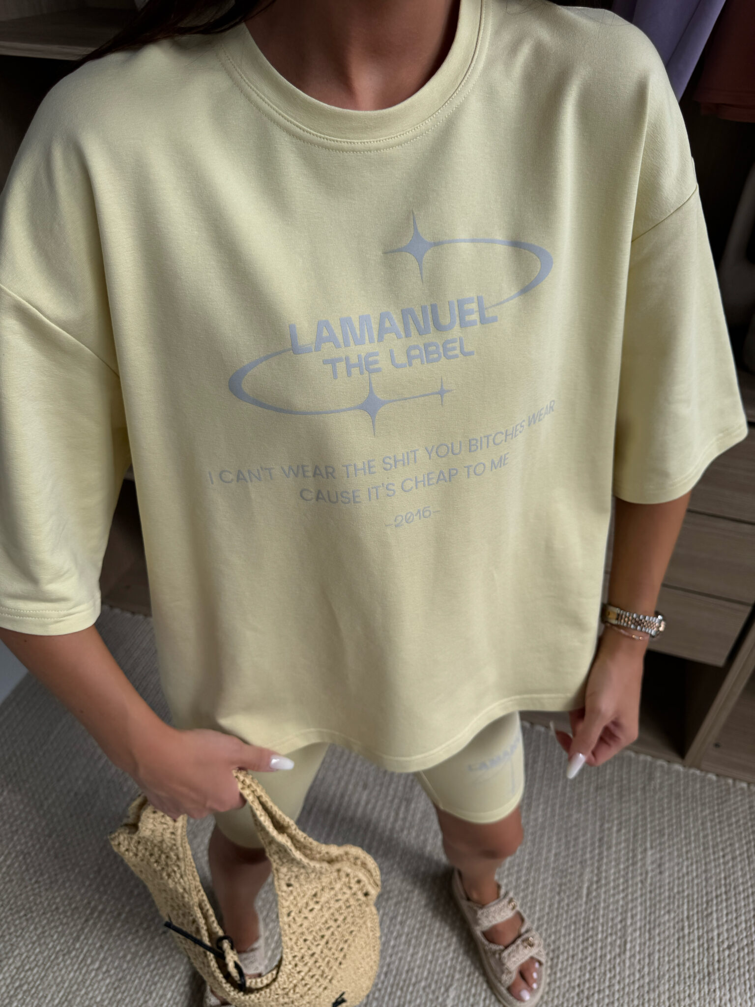 T-shirt o luźnym, oversize’owym kroju wykonany z miękkiej dzianiny bawełnianej. Na froncie znajduje się duży nadruk z nazwą marki oraz hasłem w stylu manifestu, utrzymanym w estetyce futurystycznej. Rękawy sięgające do łokcia i klasyczne wykończenie dekoltu zapewniają komfort noszenia i swobodny charakter. Model idealnie wpisuje się w streetwearowy styl, łącząc wygodę z mocnym przekazem. Połącz go do zestawu z kolarkami BURST w tym samym stylu.