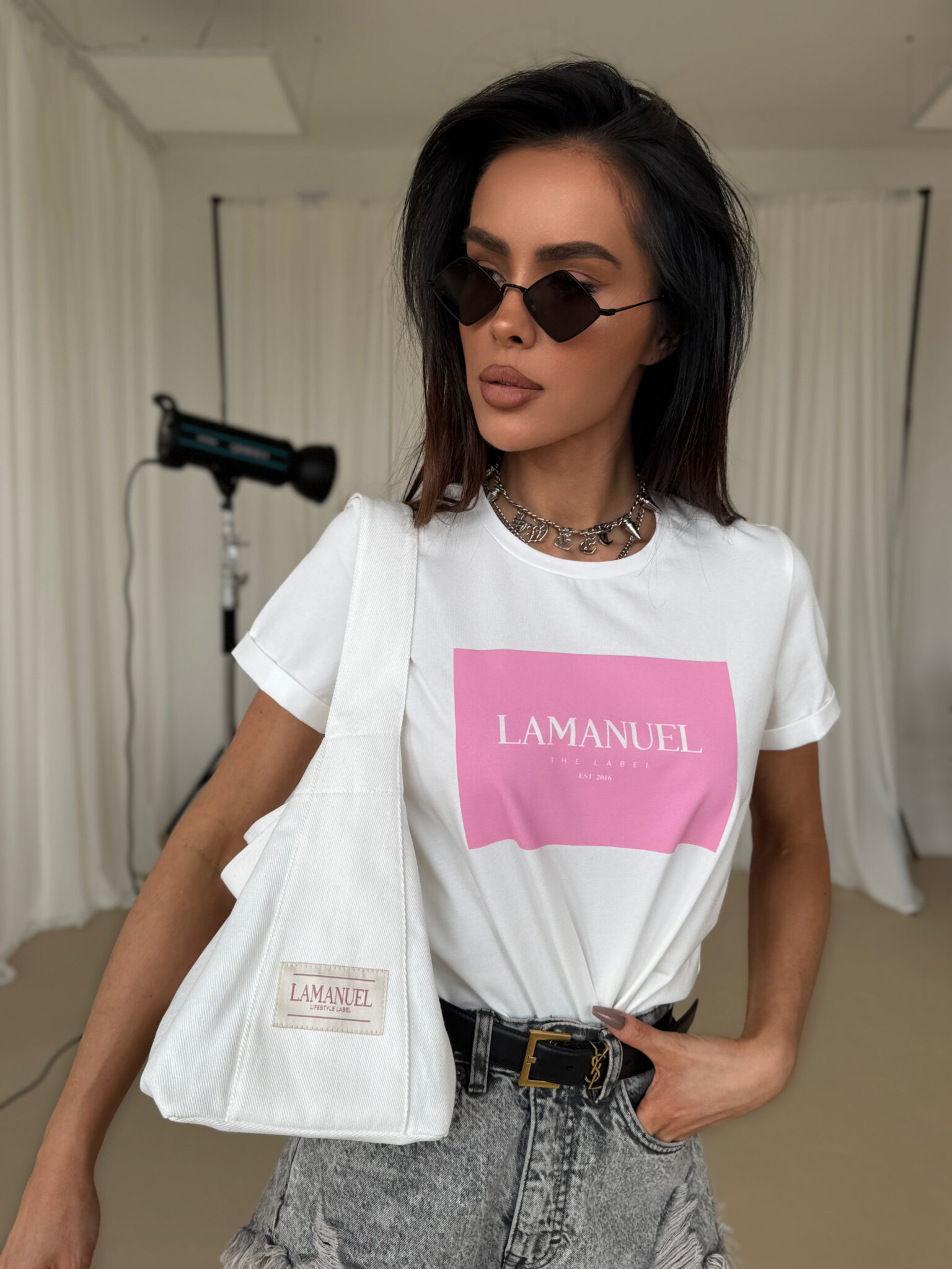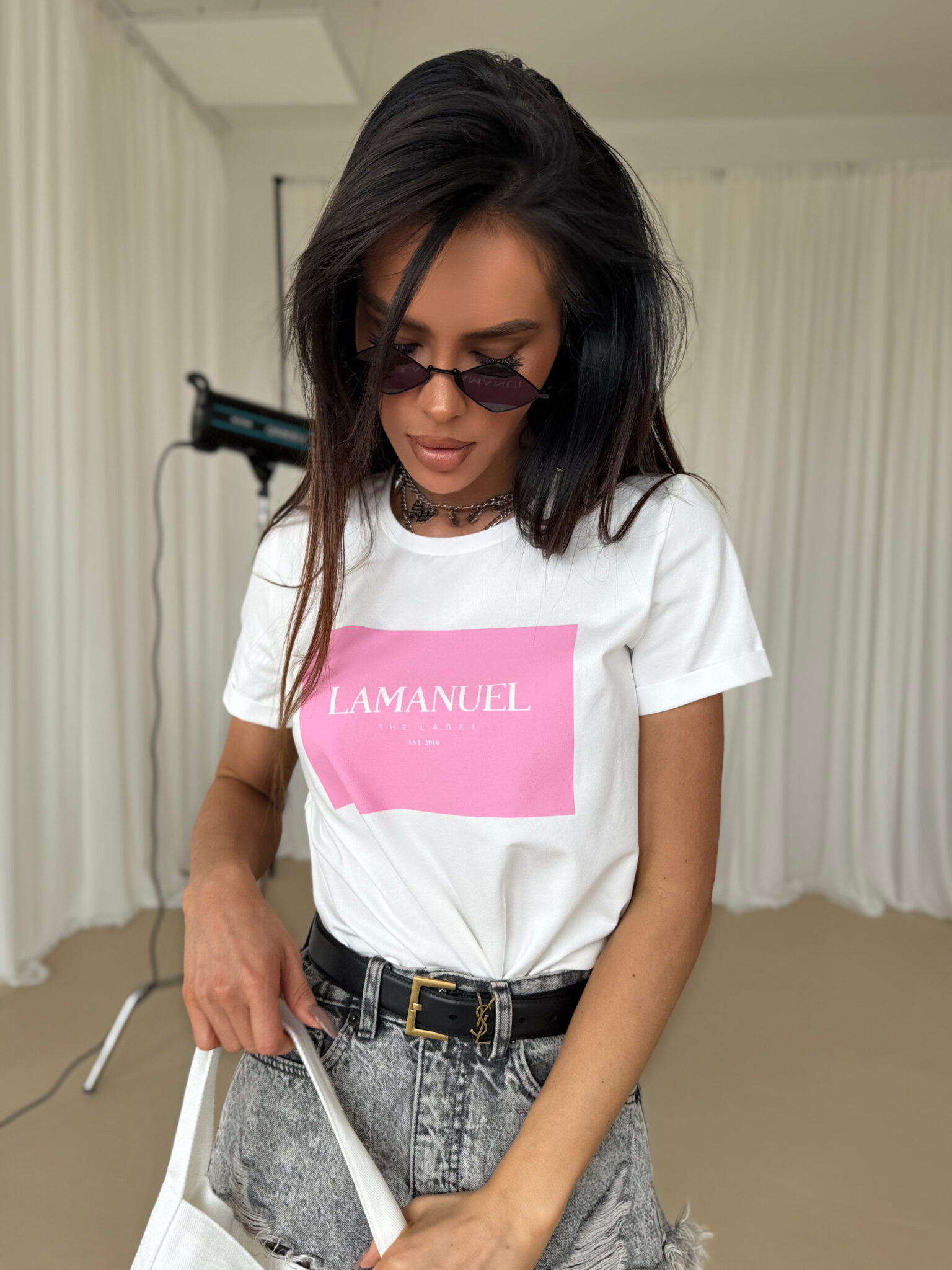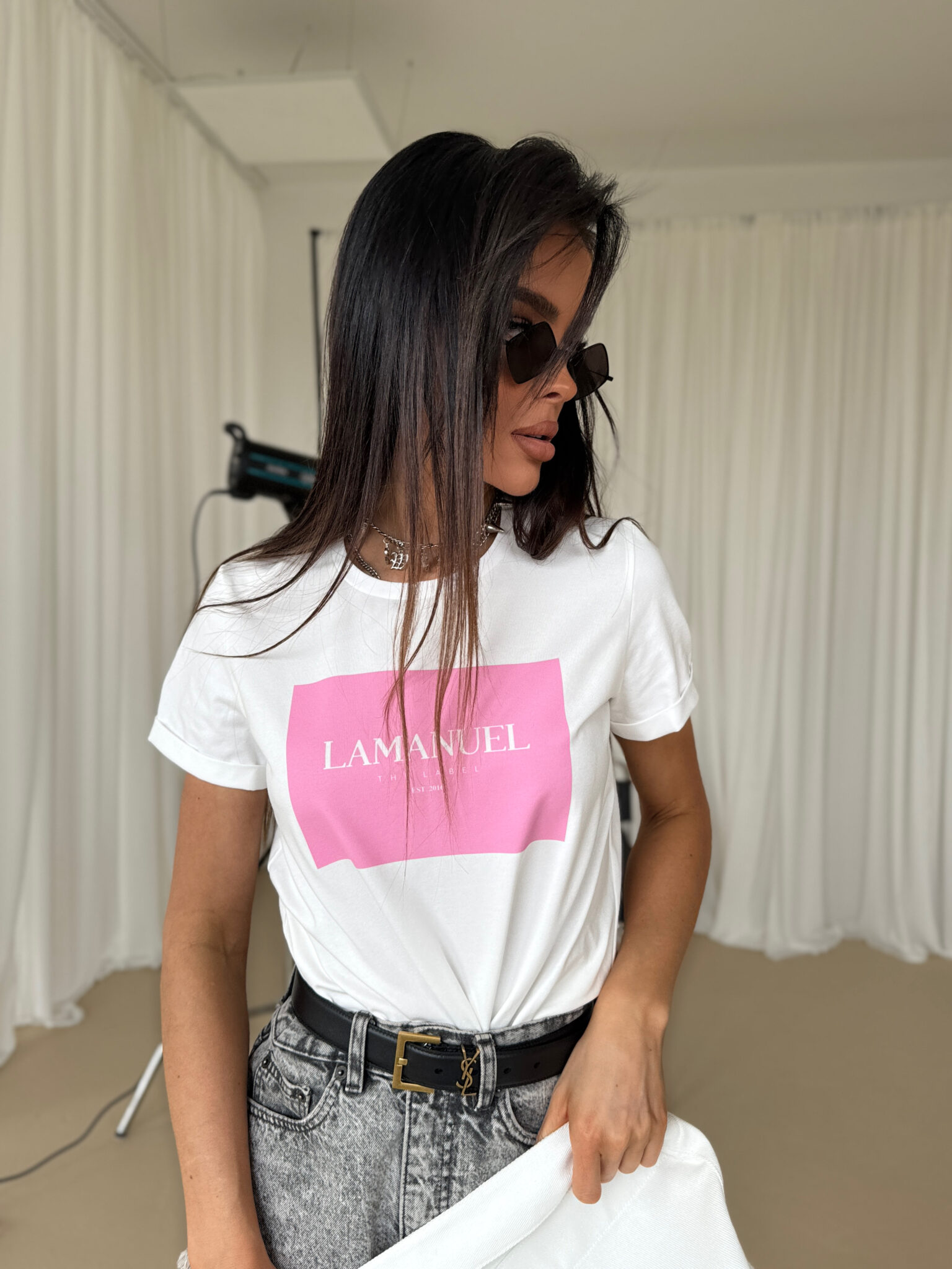 T-shirt o klasycznym kroju z krótkim rękawem i okrągłym dekoltem, wykonany z miękkiej i oddychającej tkaniny. Luźny fason zapewnia komfort noszenia i swobodę ruchów. Na przodzie znajduje się kontrastowy nadruk z logotypem, który nadaje koszulce nowoczesny charakter. Podwinięte rękawy dodają jej casualowego stylu, a uniwersalny design sprawia, że świetnie komponuje się zarówno z jeansami, jak i bardziej eleganckimi elementami garderoby. Idealny na co dzień, do sportowych i miejskich stylizacji. Może być noszony zarówno luźno, jak i wpuszczony w spodnie czy spódnicę dla bardziej dopasowanego efektu.