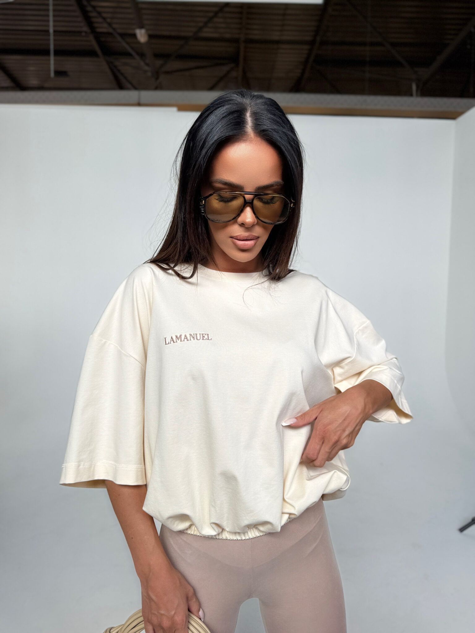 T-shirt o oversize’owym kroju z krótkim rękawem i subtelnym logo lamanuel na piersi. Uszyty z przyjemnej w dotyku bawełnianej dzianiny, zapewnia maksymalny komfort noszenia i swobodę ruchów. Dół wykończony elastyczną gumką, dzięki czemu możesz nosić go luźno lub lekko podciągnięty, eksponując talię. Uniwersalny fason sprawdzi się zarówno w sportowych zestawieniach, jak i w codziennych, minimalistycznych stylizacjach.