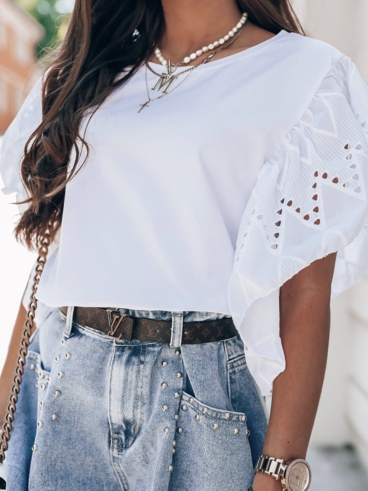Wyjątkowy, oversize’owy T-shirt Lina, wykonany z wysokiej jakości dzianiny. Ażurowe rękawy dodają charakteru stylizacji. Materiał delikatnie się poddaje. Made in Poland.