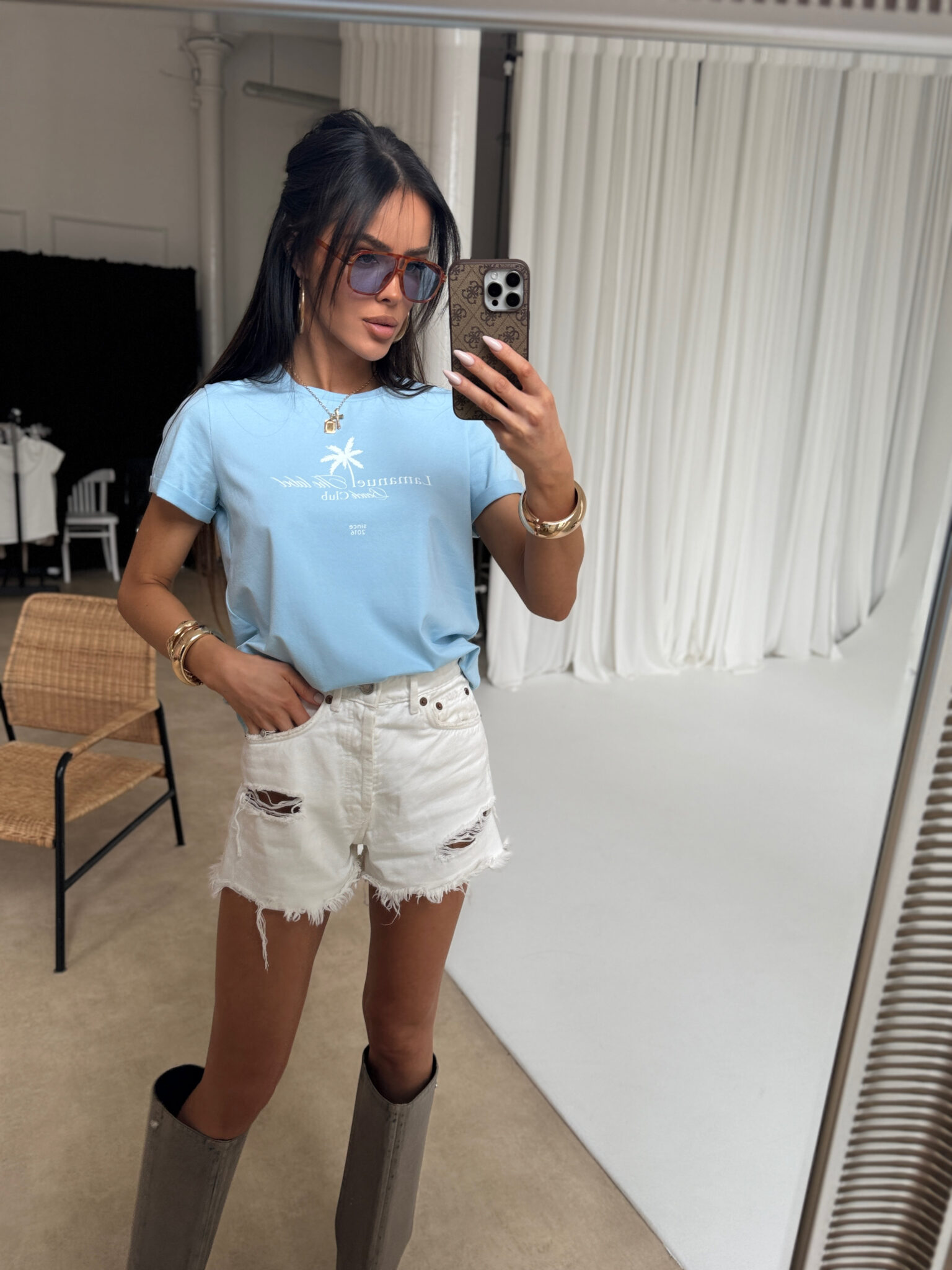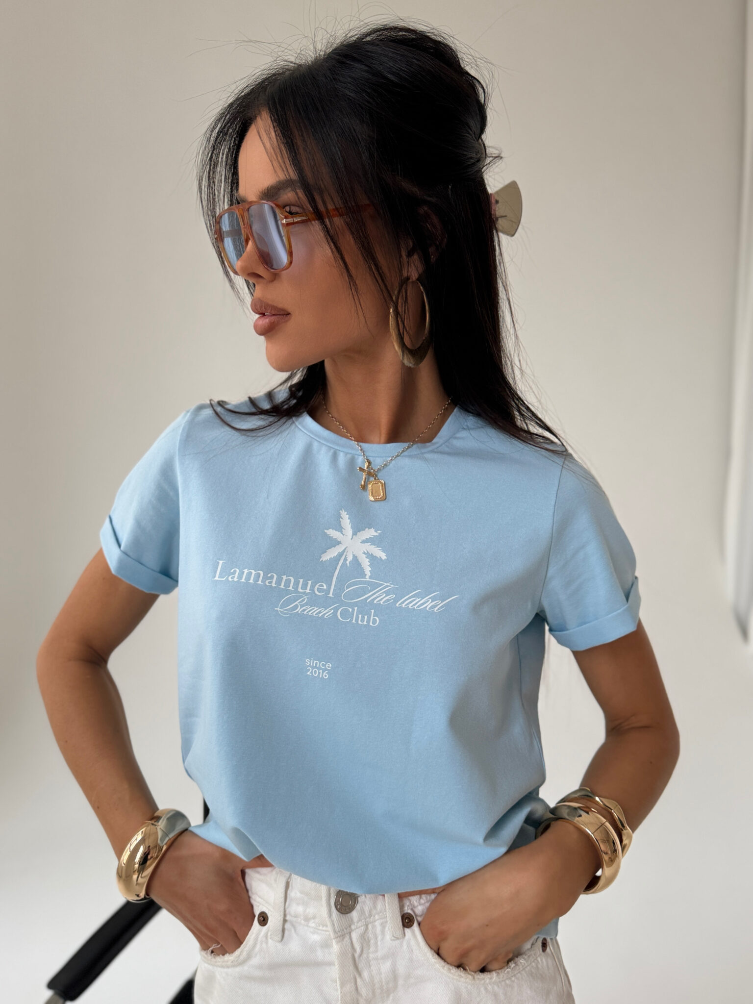 Ten t-shirt to połączenie klasyki i wakacyjnego luzu. Wykonany z miękkiej, przyjemnej w dotyku tkaniny, zapewnia komfort noszenia na co dzień. Jego minimalistyczny design urozmaicony jest subtelnym nadrukiem z motywem palmy oraz logo marki, co nadaje mu unikalnego charakteru. Podwinięte rękawki dodają mu lekkości i swobodnego stylu. Doskonale sprawdzi się zarówno w casualowych stylizacjach, jak i w zestawach na letnie dni. Można go połączyć ze skarpetkami z tym samym motywem, tworząc spójny komplet.