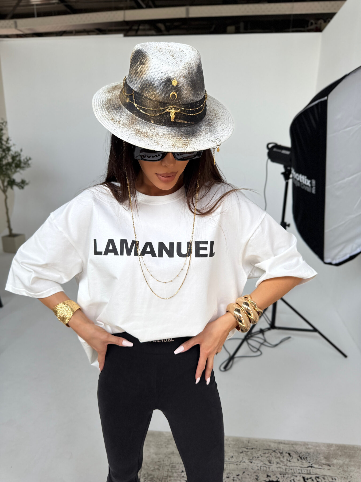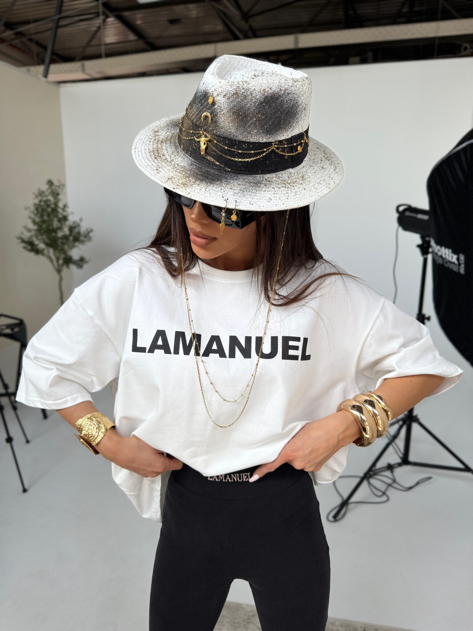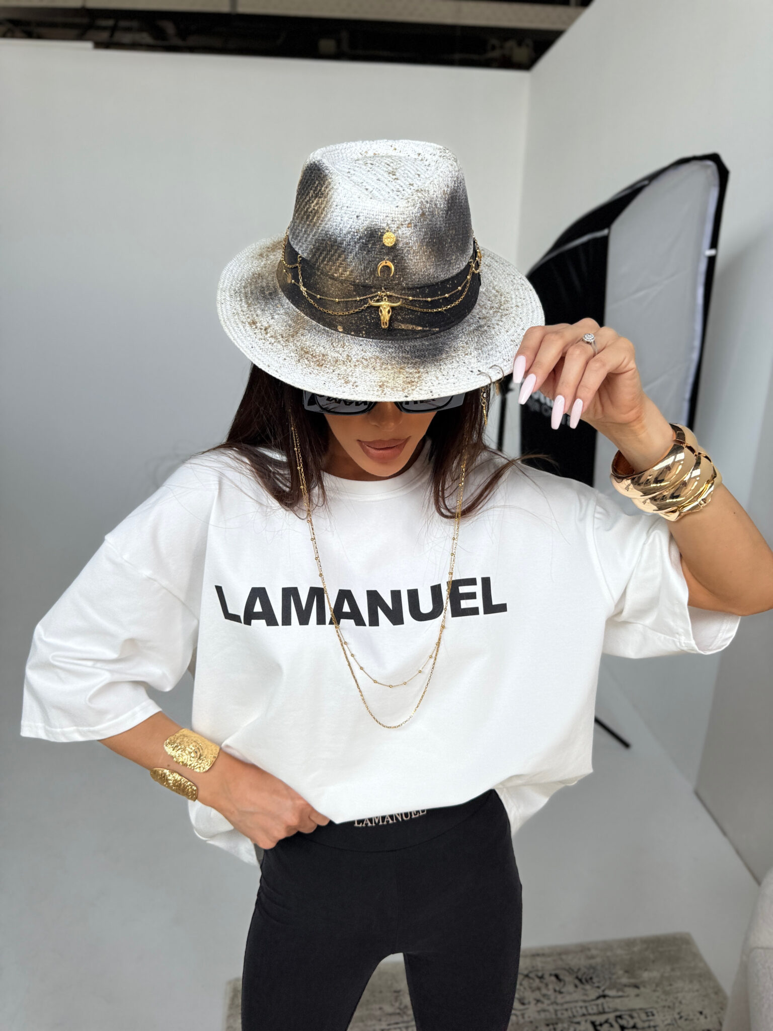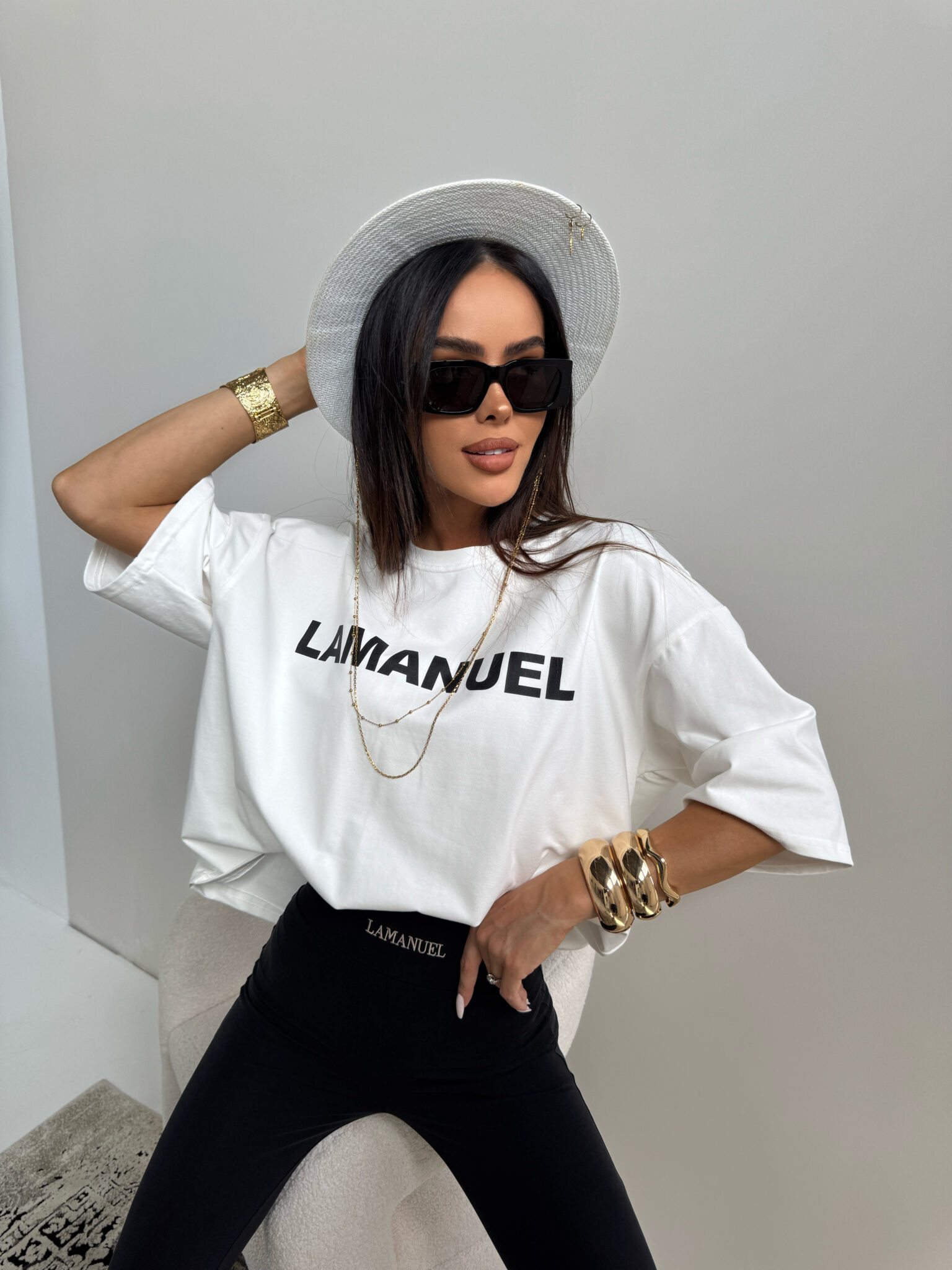 Oversize’owy T-shirt o luźnym kroju wykonany z wysokiej jakości bawełny, zapewniającej wygodę noszenia i swobodę ruchów. Prosty fason z lekko obniżoną linią ramion, który świetnie układa się na sylwetce i pasuje do różnych stylizacji – zarówno sportowych, jak i bardziej casualowych. Na przodzie nadrukowane logo LAMANUEL w kontrastowym wykończeniu, które przyciąga wzrok i nadaje charakteru. T-shirt sprawdzi się zarówno w zestawieniu z dresami, legginsami, jak i z jeansami czy szortami.