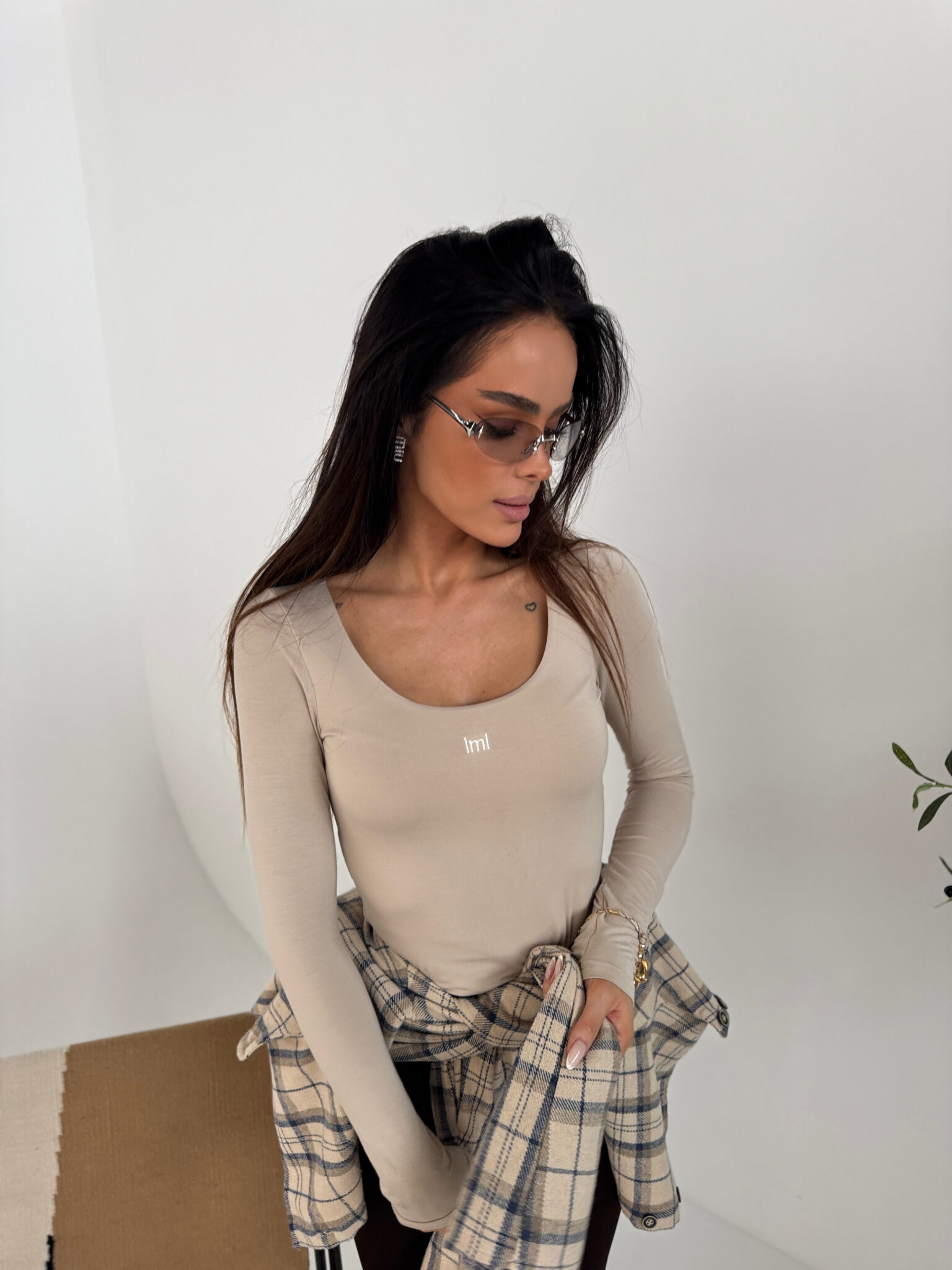 Dopasowany top z długim rękawem i głębokim, zaokrąglonym dekoltem. Wykonany z elastycznej, miękkiej dzianiny, która idealnie przylega do sylwetki. Z przodu drobny haft z logo. Minimalistyczny fason idealny do stylizacji codziennych, sportowych i casualowych.