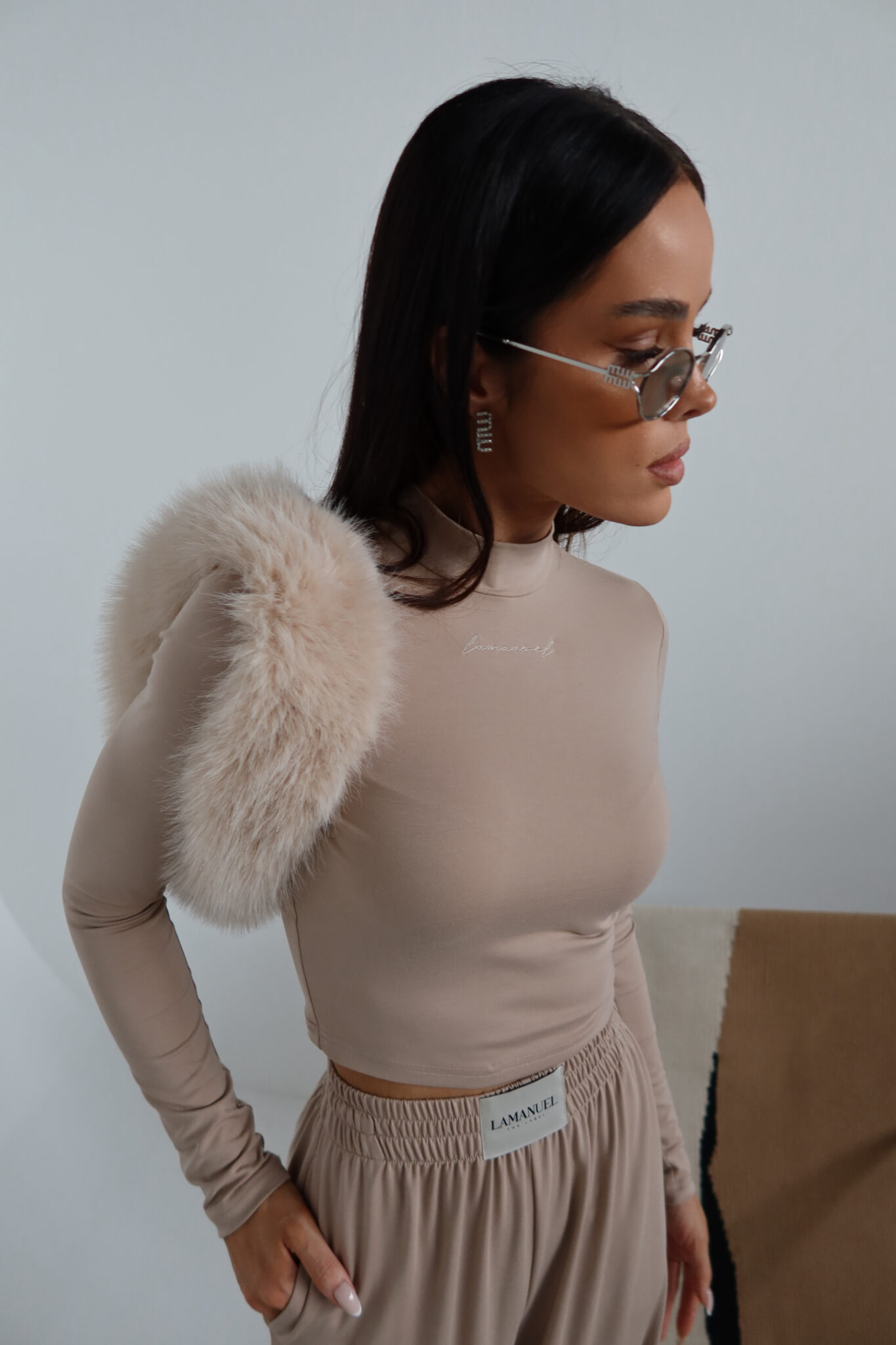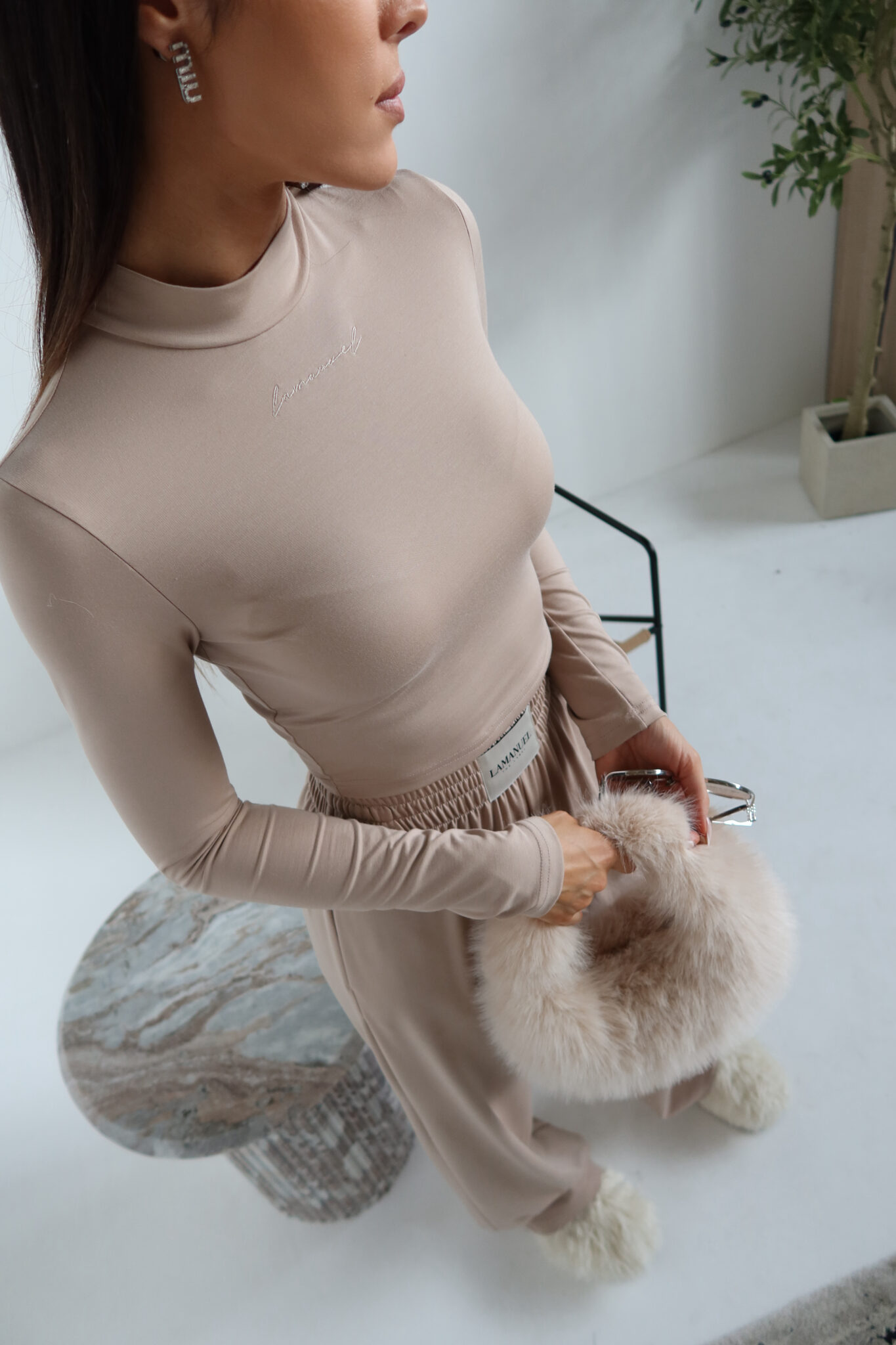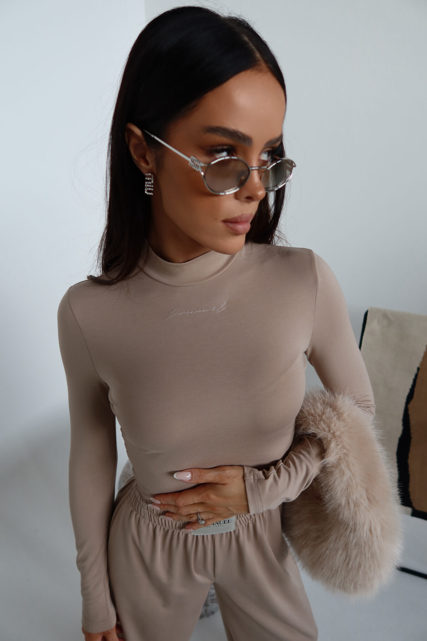 Dopasowany top z długim rękawem wykonany z miękkiej, elastycznej dzianiny modalowej. Posiada zabudowany dekolt i krótszy krój, który idealnie komponuje się ze spodniami z wysokim stanem. Subtelne logo z przodu w kolorze materiału. Komfortowy, oddychający i przyjemny dla skóry.