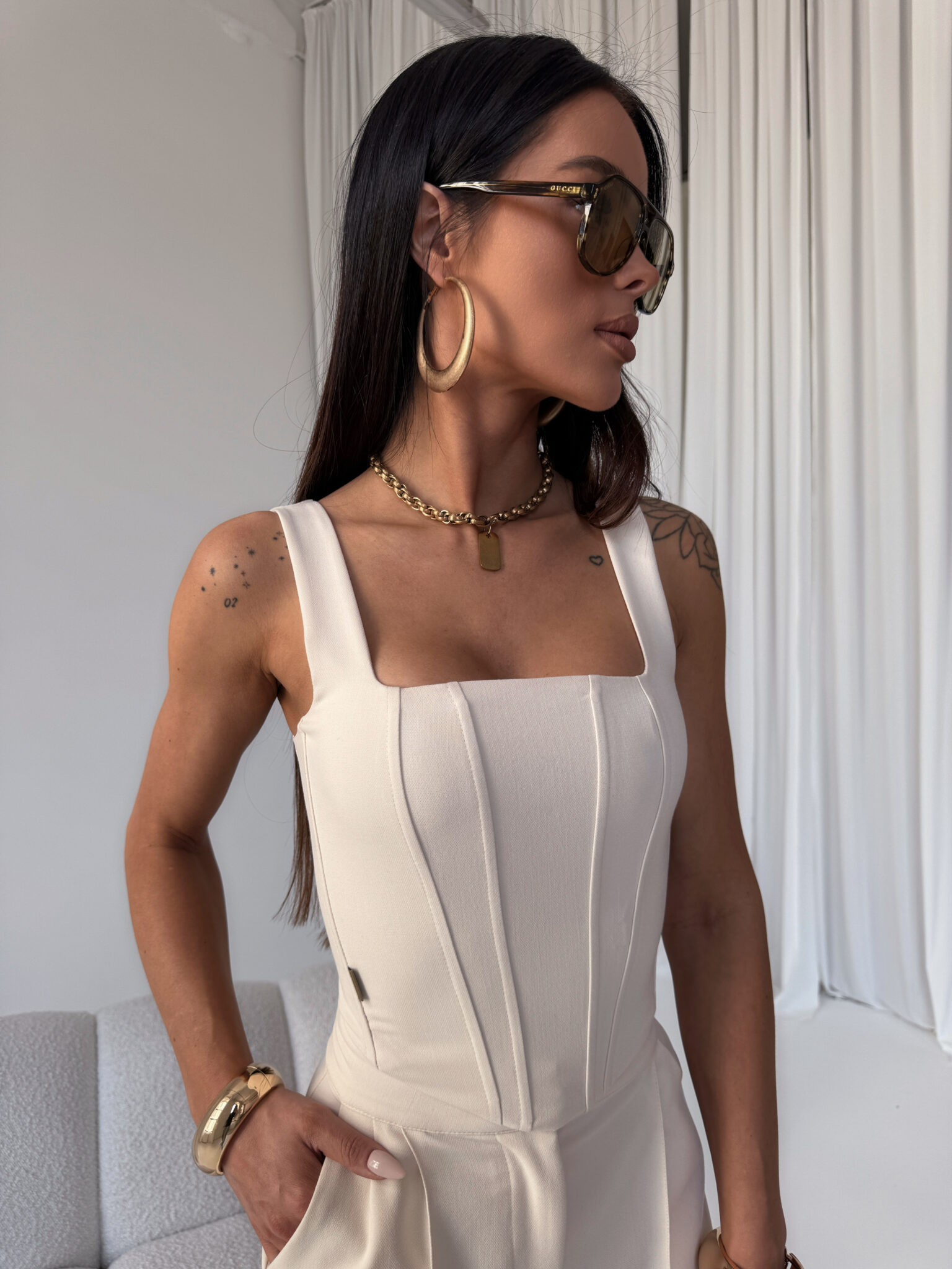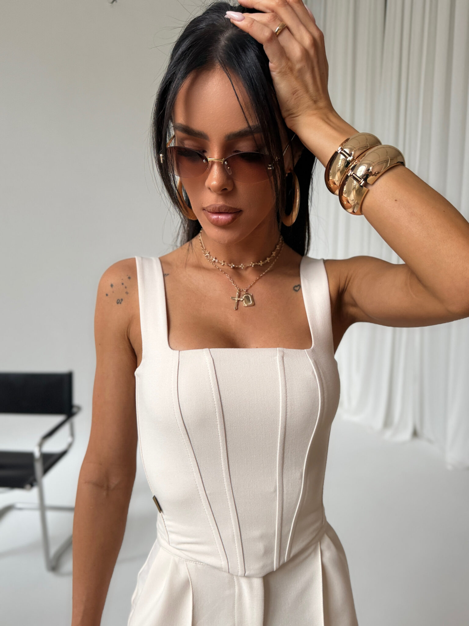 Gorset o dopasowanym kroju, wykonany z eleganckiej tkaniny z subtelną fakturą. Posiada szerokie ramiączka i geometryczny dekolt podkreślający linię ramion. Model usztywniony przeszyciami i fiszbinami, które optycznie wysmuklają sylwetkę. Zapinany na suwak z tyłu, co zapewnia wygodne dopasowanie. Doskonały zarówno do klasycznych, jak i nowoczesnych stylizacji, świetnie komponuje się z szerokimi spodniami i dopasowanymi spódnicami oraz spodenkami.