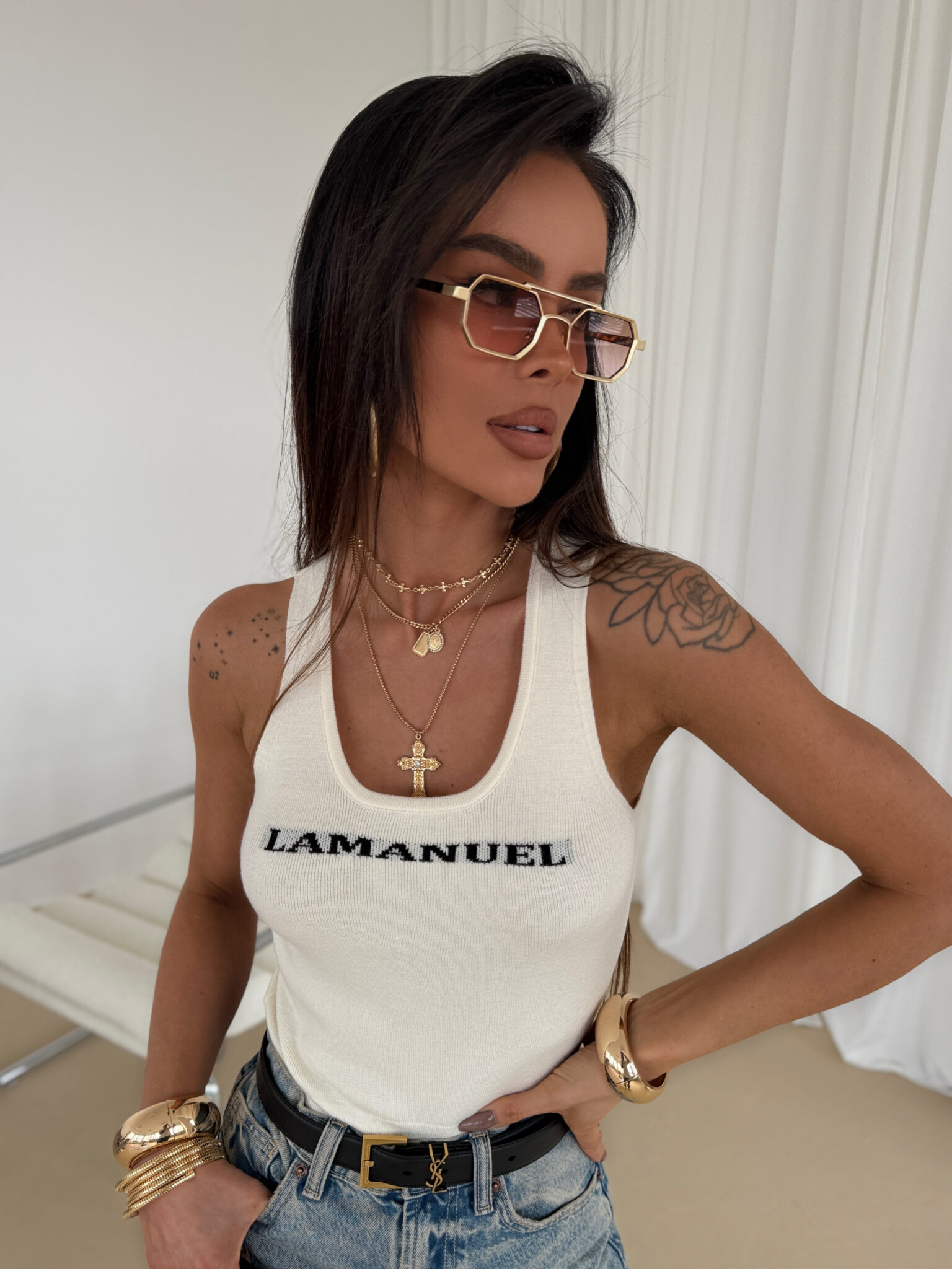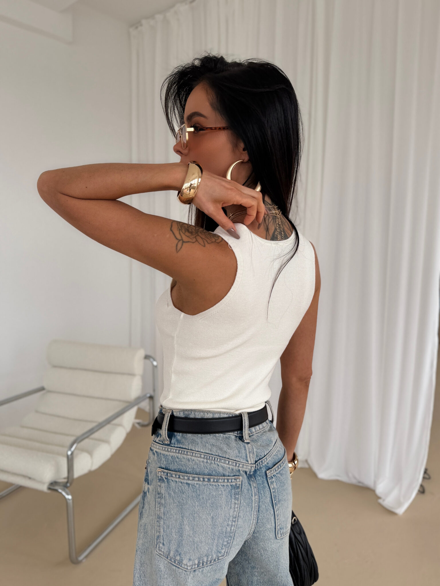 Ten top został wykonany z wysokiej jakości przędzy dziewiarskiej, co sprawia, że jest niezwykle miękki i elastyczny, idealnie dopasowując się do sylwetki. Jego klasyczny krój bez rękawów podkreśla ramiona, a subtelne logo wykonane w technice dzianinowej dodaje mu unikalnego charakteru. Dzięki elastycznemu wykończeniu świetnie układa się na ciele, nadając stylizacji nowoczesny i dopracowany wygląd. To doskonały wybór zarówno na casualowe stylizacje, jak i eleganckie zestawy w połączeniu z marynarką czy jeansami.