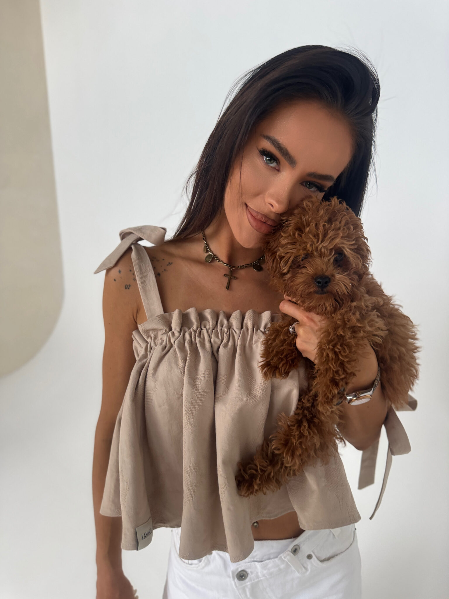 Top o luźnym, swobodnym kroju z marszczeniem na górze, które tworzy efekt falban. Model na ramiączkach do wiązania, co pozwala na regulację długości. Tył wiązany na kokardę, odsłaniający plecy. Całość wykonana z tkaniny o delikatnej strukturze, dodającej charakteru. Idealny do letnich stylizacji w połączeniu ze spodniami lub spódnicą.