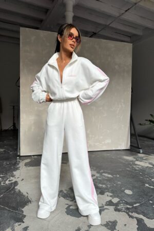 Stylowy design łączy sportową elegancję z subtelnym logo na bluzie. Materiał jest miękki i przyjemny w dotyku, co sprawia, że kombinezon doskonale sprawdzi się na każdą porę roku. Oversize’owy krój dodaje luzu i nowoczesnego wyglądu, a szerokie nogawki z lampasami optycznie wydłużają sylwetkę. Dzięki zamkowi pod szyją można regulować głębokość dekoltu, a elastyczny pas zapewnia idealne dopasowanie.