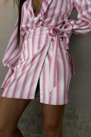 Fenomenalny komplet w kolorze różu. Koszula o luźnym fasonie z długim rękawem zapinanym na guzik łączy w sobie wygodę i stylu. Materiał w paski to najmodniejszy print tego sezonu. Krój zapewnia przewiewność, a ciekawe rękawy z mankietem dodaje klasy. Przekładana z przodu podkreśla pięknie dekolt. Spódnica wiązana to połączenie minimalizmu z subtelnym stylem. Jej prosty design sprawia, że pasuje na każdą okazję od bardziej eleganckich wyjść po codzienne spotkania. Made in Poland .