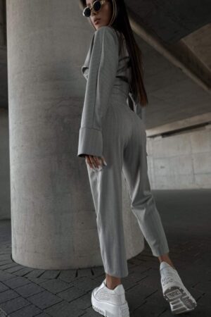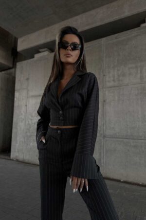 Damski komplet w paski składający się z marynarki o ciekawym kroju kimona oraz spodni cygaretek. Marynarka jest szersza pod pachami, a dopasowana w talii, dzięki czemu uzyskujemy podkreślenie sylwetki klepsydry. Wybierz go na wieczorne wyjścia bądź na co dzień, idealnie pasuje zarówno do szpilek jak i trampek. Made in Poland .