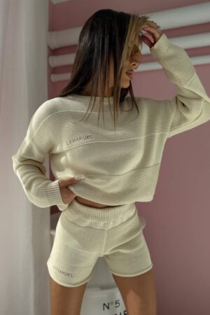 Na taki model czekałyście! Nasz sweterkowy komplet składający się ze spodenek z wysokim stanem oraz bluzki z długim rękawem to idealne połączenie wygody i elegancji. Bluzka z długim rękawem i dekoltem w łódkę dodaje klasy i subtelności całej stylizacji. Dzięki delikatnemu dekoltowi w łódkę, bluzka podkreśla szyję i ramiona, nadając kobiecego charakteru. Wykonana z miękkiego materiału, zapewnia komfort noszenia przez cały dzień. Spodenki z wysokim stanem dodają nuty retro do Twojej stylizacji, podkreślając kobiecą sylwetkę i zapewniając wygodę noszenia. Ich uniwersalny fason sprawia, że są odpowiednie na wiele różnych okazji, od codziennych spacerów po wyjścia ze znajomymi. Made in Poland .