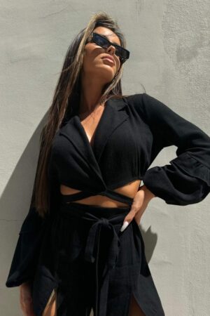 Dwuczęściowy damski komplet to harmonijne połączenie elegancji i komfortu. Koszula z bufiastymi rękawami z falbanką dodaje stylu i romantycznego uroku, podczas gdy wiązanie w talii podkreśla kobiecą sylwetkę. Wykonana z wysokiej jakości materiałów, gwarantuje wygodę noszenia przez cały dzień. Spodenki uzupełniają całość, tworząc zgraną stylizację idealną na różne okazje. Doskonałe na letnie dni, spotkania ze znajomymi czy wieczorne wyjścia. Ten komplet to nie tylko wybór modowy, ale także praktyczny, który z pewnością przyciągnie spojrzenia i podkreśli indywidualny styl noszącej. Made in Poland