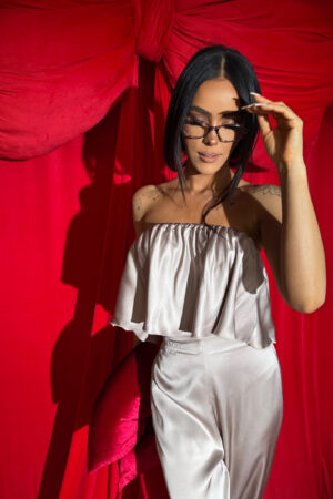 Ten komplet to kwintesencja luksusu w domowej odsłonie. Wykonany z naturalnej wiskozy o satynowym wykończeniu, zachwyca miękkością, subtelnym połyskiem i eleganckim ruchem tkaniny przy każdym kroku. Top bez ramiączek z falbaną delikatnie podkreśla ramiona, a szerokie spodnie z wysokim stanem i efektownym marszczeniem z tyłu pięknie układają się na sylwetce – zwłaszcza na biodrach i pośladkach.