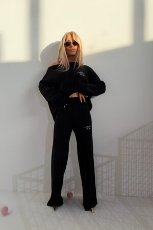 Dzianina o wyraźnym, pionowym prążku – miękka, elastyczna, dobrze układająca się w ruchu. Góra z opuszczoną linią ramion, szerokim rękawem i lekko oversize’owym krojem. Można nosić klasycznie lub opuścić na jedno ramię. Spodnie z wysokim stanem i prostą nogawką. Pas szeroki, elastyczny – bez widocznych sznurków czy zapięć. Na piersi i biodrze haftowane logo w minimalistycznym stylu. Całość tworzy sylwetkę, ale nie opina. Miękkość dzianiny + struktura prążka = zestaw, który nie wygląda jak homewear, ale nosi się jak homewear.