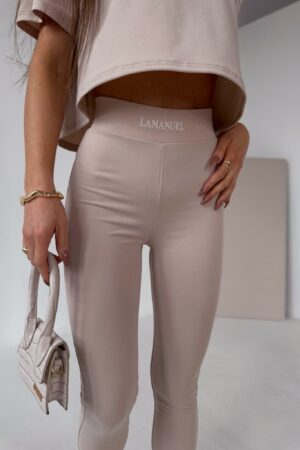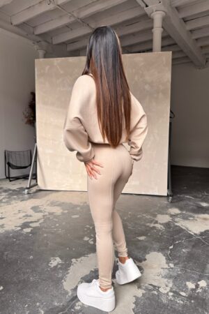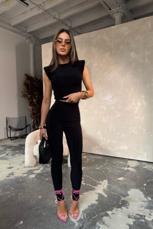 Nowoczesny komplet, który łączy minimalistyczny design z odważnym charakterem. Dopasowany top z poduszkami na ramionach i legginsy z wysokim stanem tworzą idealne zestawienie, które modeluje sylwetkę i zapewnia efektowny wygląd.