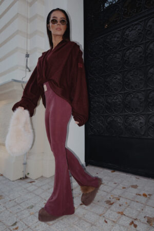Legginsy z rozszerzaną nogawką, uszyte z mięsistego i elastycznego materiału z „misiem” od wewnątrz – miękkie, ciepłe i bardzo komfortowe. Wysoki stan pięknie podkreśla talię, a naszyta z przodu metka z logo dodaje im charakteru. Połączenie stylu, wygody i jakości premium.