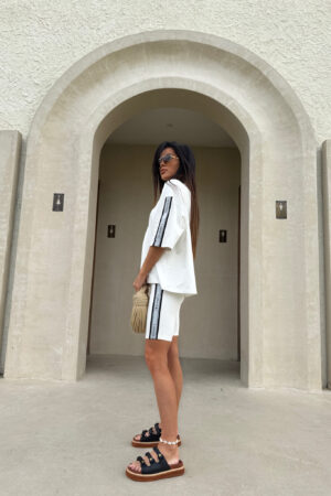 Spodenki wykonane z tej samej tkaniny w paski co koszula YACHT tworzą idealne dopełnienie. Posiadają szeroki, gładki pas z ozdobnym wiązaniem, który podkreśla talię. Nogawki są krótkie, proste, nieopinające, co sprawia, że całość prezentuje się lekko i nowocześnie. Świetnie sprawdzą się zarówno jako element kompletu, jak i w zestawieniu z bardziej casualowymi górami.