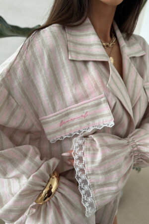 Ten komplet to idealna propozycja na lato – lekki, przewiewny i bardzo stylowy. Składa się z koszuli oraz pasujących do niej szortów, które razem tworzą spójną i romantyczną stylizację w klimacie boho i vintage. Koszula ma luźny, oversize’owy krój z dłuższym tyłem, co nadaje jej swobodnego, nonszalanckiego charakteru. Wykonana jest z lekkiej, lnianej mieszanki, która świetnie sprawdza się w ciepłe dni. Uwagę przyciąga wzór – delikatne pionowe paski w stonowanych, naturalnych odcieniach, które nadają całości świeżości i lekkości. Szorty z wysokim stanem i elastyczną gumką w pasie, co zapewnia wygodę noszenia. Są luźne, nieopinające, dzięki czemu świetnie układają się na sylwetce. Ich dół wykończony został falbaną, nawiązującą do rękawów koszuli. Pasuje zarówno do kowbojek, sandałów, jak i sneakersów, a dodatki takie jak wiklinowy koszyk czy mini torebka będą jego idealnym uzupełnieniem.