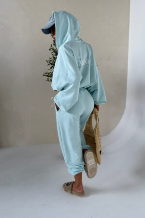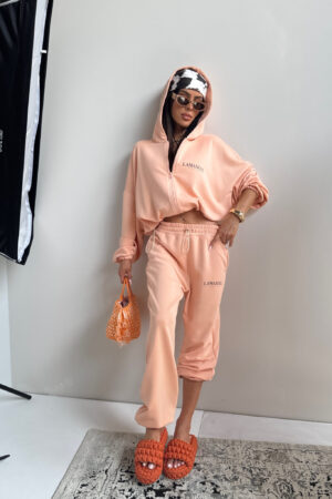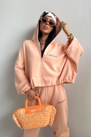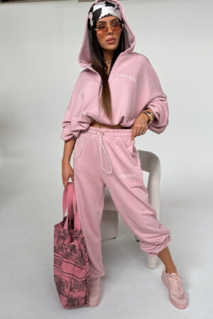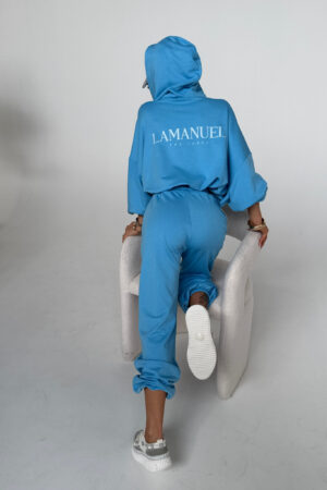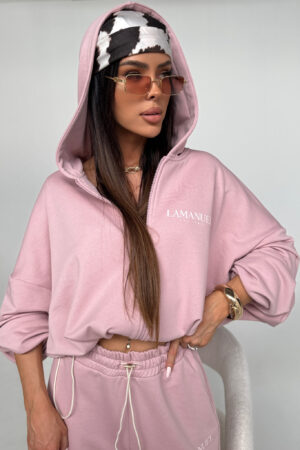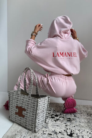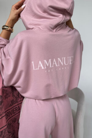 Bluza o luźnym kroju zapinana na suwak z kapturem i wszytym ściągaczem na dole, który umożliwia regulację szerokości i podkreślenie talii. Rękawy szerokie, zakończone delikatną gumką. Na piersi oraz na plecach znajduje się wyraziste logo LAMANUEL, które nadaje całości charakteru. Model wykonany z miękkiej, przyjemnej w dotyku dzianiny, idealny na co dzień i w podróży. Szerokie spodnie dresowe, stylizowane na męskie z wysokim stanem i elastyczną gumką w pasie oraz dodatkowym troczkiem do regulacji. Szeroka, prosta nogawka i wygodny krój zapewniają komfort noszenia i swobodę ruchów. Na biodrze widoczne logo LAMANUEL