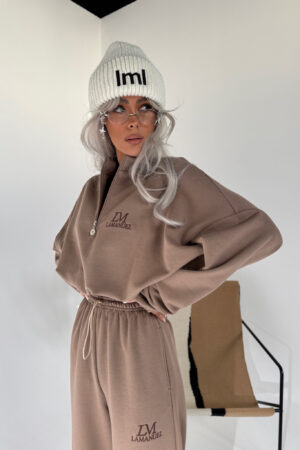 Bluza o swobodnym kroju, którą możesz nosić w dłuższej wersji lub ściągnąć w talii dzięki wszytemu sznurkowi. Suwak przy dekolcie i haftowane logo dopełniają całości. Uniwersalna, komfortowa, sprawdzi się w zestawie lub jako osobny element stylizacji. Luźne, wygodne spodnie z prostą nogawką i elastycznym pasem. Złoty detal w talii dodaje im lekkiego wyrafinowania, a haft z logo podkreśla charakter marki. Idealne do noszenia na co dzień – solo albo w komplecie.
