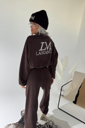Spodnie dresowej, wysoki stan, elastyczna guma w pasie, ściągacze przy kostkach. Swobodna, lekko zwężana nogawka. Na przodzie subtelny nadruk LAMANUEL. Świetnie wygląda solo i w komplecie .