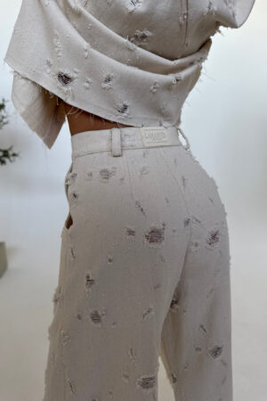To nie są zwykłe jeansy — to manifest stylu. Klasyczny fason z wysokim stanem i luźną nogawką zyskał zupełnie nowy wymiar dzięki unikalnemu przeszyciu na udzie. To nie ozdoba, to funkcjonalny detal – wystarczy lekko odchylić materiał, a odsłania się zadziorne wycięcie. Niby klasyk, ale z ukrytą niespodzianką. Denim dla tych, którzy nie boją się mody z charakterem.