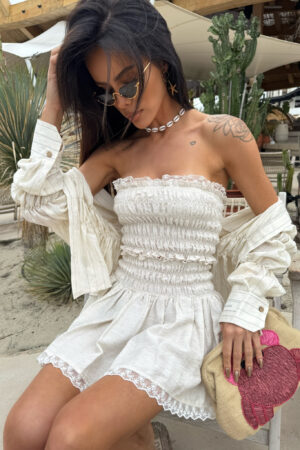 Letni komplet wykonany z lekkiego, przewiewnego materiału, składający się z topu bez ramiączek oraz krótkiej spódniczki. Całość uszyta na elastycznych gumoniciach, które tworzą efektowne marszczenia i gwarantują idealne dopasowanie do sylwetki. Spódniczka i top wykończone delikatną koronką dodają całości subtelności i kobiecego uroku. Stylowy zestaw idealny na ciepłe dni, wakacyjne wyjazdy i letnie spacery. Produkt mocno uciągliwy.