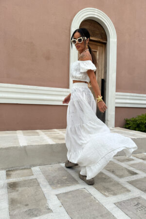 Komplet składa się z krótkiego topu z odkrytymi ramionami i marszczeniem oraz długiej, zwiewnej spódnicy w tym samym stylu, wykonany jest z lekkiego, półtransparentnego materiału z delikatnym połyskiem i subtelnym, wytłaczanym wzorem dodającym elegancji i letniego luzu, całość idealnie wpisuje się w klimat resortowy dzięki jasnej kolorystyce i kobiecej formie która pięknie układa się w ruchu i zapewnia komfort nawet w upalne dni.