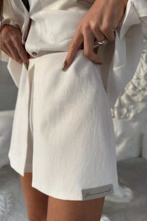 Spódnico-spodenki o eleganckim kroju z wysokim stanem, łączące klasyczny wygląd spódnicy z funkcjonalnością szortów. Wykonane z wysokiej jakości tkaniny, która zapewnia wygodę noszenia i doskonałe dopasowanie do sylwetki. Przód zaprojektowany w formie gładkiego panelu, nadającego minimalistycznego charakteru, z subtelnym haftowanym detalem. Tył posiada klasyczne kieszenie, które dodają elegancji i praktyczności. Dzięki uniwersalnemu fasonowi doskonale sprawdzą się zarówno w codziennych stylizacjach, jak i w bardziej eleganckich zestawieniach. Można je łączyć z marynarką, koszulą lub dopasowanym topem, tworząc harmonijną i stylową całość.