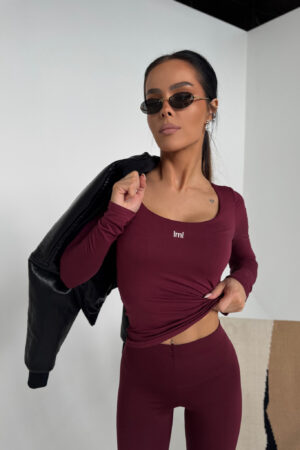 Dopasowany top z długim rękawem i głębokim, zaokrąglonym dekoltem. Wykonany z elastycznej, miękkiej dzianiny, która idealnie przylega do sylwetki. Z przodu drobny haft z logo. Minimalistyczny fason idealny do stylizacji codziennych, sportowych i casualowych.