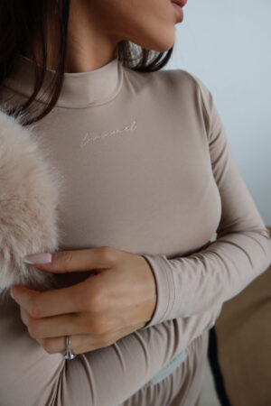 Dopasowane body wykonane z miękkiej, elastycznej wiskozy, która delikatnie przylega do ciała i pięknie podkreśla sylwetkę. Fason z długim rękawem zakończonym marszczeniem oraz zabudowanym dekoltem dodaje elegancji i minimalizmu. Na przodzie haftowane logo lamanuel. Dół na stringi – niewidoczny pod ubraniem, komfortowy i praktyczny w noszeniu. Idealna baza do stylizacji codziennych i bardziej wyjściowych – body, które zrobi robotę zawsze i wszędzie.