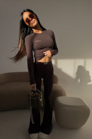 Dopasowany top z długim rękawem wykonany z miękkiej, elastycznej dzianiny modalowej. Posiada zabudowany dekolt i krótszy krój, który idealnie komponuje się ze spodniami z wysokim stanem. Subtelne logo z przodu w kolorze materiału. Komfortowy, oddychający i przyjemny dla skóry.